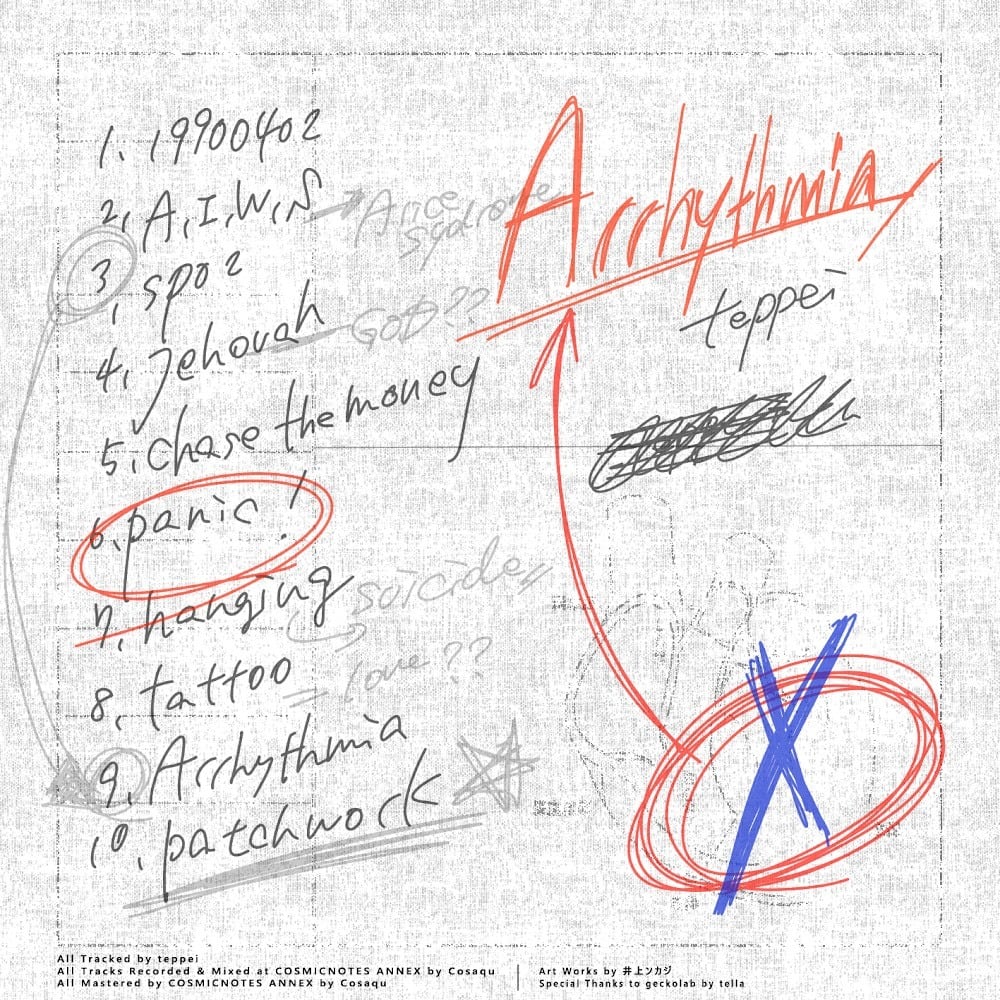 ラッパー集団、梅田サイファーからラッパー兼トラックメイカーであるteppeiのソロアルバム。 teppei自身が手掛けるトラックは民族音楽をベースとしたトライバルなテイストのモノから耳馴染みの良いものまで、ルーツである宗教や芸術を踏襲した、どれも一癖ある楽曲が並んでいる。 アルバムの幕開けはMVにもなっている「19900402」自分がどこから来たのかを静かだが熱量を感じるトラックに載せて高らかに歌い上げる。 「spo2」では2019年末に渋谷WWWで行われた梅田サイファーのワンマンライブ中に心不全となり死にかけた経緯をラッパーならではの伝え方で表現する。 続く「Jehovah」では自身の宗教のルーツを赤裸々に語り、宗教2世として生きてきた上での弊害や苦悩をトライバルなトラックの上で荒々しくラップする。 タイトル曲でもある「Arrhythmia」ギターのフレーズが印象的な哀愁のあるトラックの上でteppeiの生い立ちを赤裸々に歌い上げる。 アルバムの最後を飾る「patchwork」では自分自身がどこから来てどこへ行くのか、梅田サイファーの面々の過去のリリックからサンプリングし自分の人生で関わった人に対しての感謝を歌いアルバムを締め括る。 梅田サイファーとして培ったスキルと経験を元にteppeiにしか表現出来ないトピックを並べた今作はさながらインナーチャイルドセラピーのような自分自身を広く認識するための作品となっている。